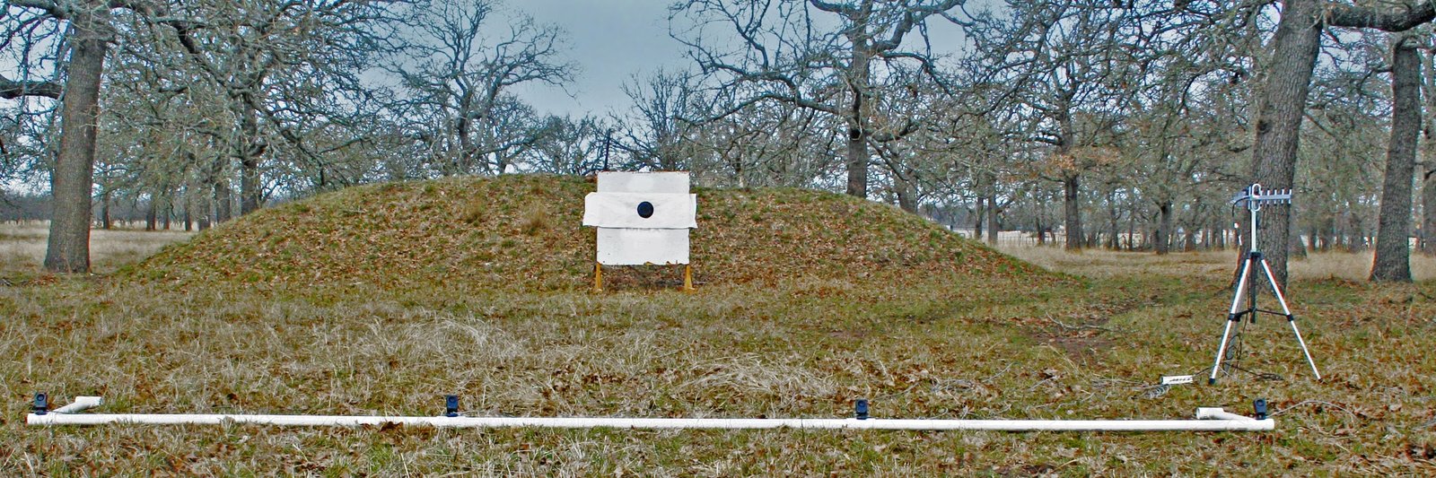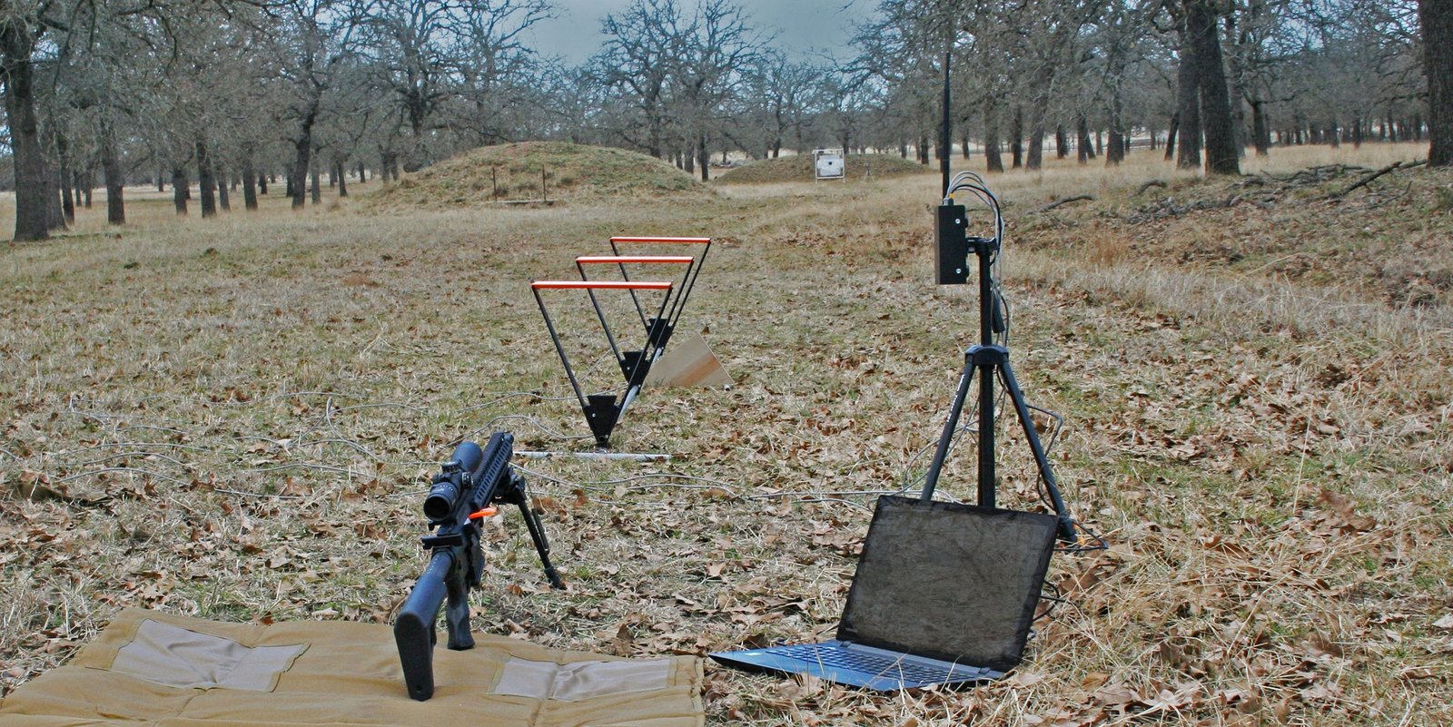 The easiest target array to use has the four microphones lined up on the ground perpendicular to the bullet’s expected path. An array 15 feet long will typically detect bullets passing within 10 feet of the array.